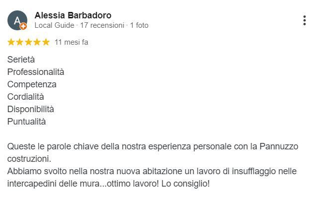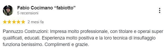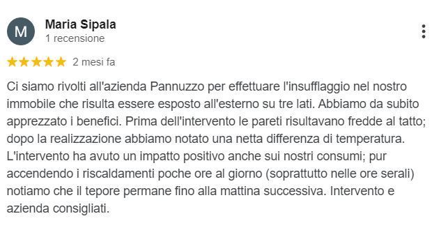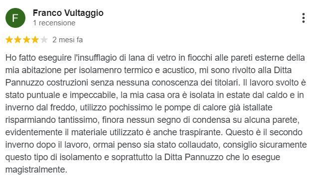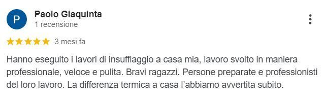 Le recensioni dei nostri clienti rappresentano il miglior indicatore della qualità dei nostri interventi di isolamento termico in Sicilia e insufflaggio. Ogni testimonianza racconta l’esperienza diretta con i nostri lavori, dalla progettazione alla realizzazione, evidenziando come gli interventi abbiano migliorato il comfort abitativo, ridotto le dispersioni energetiche e reso gli ambienti più salubri e confortevoli.